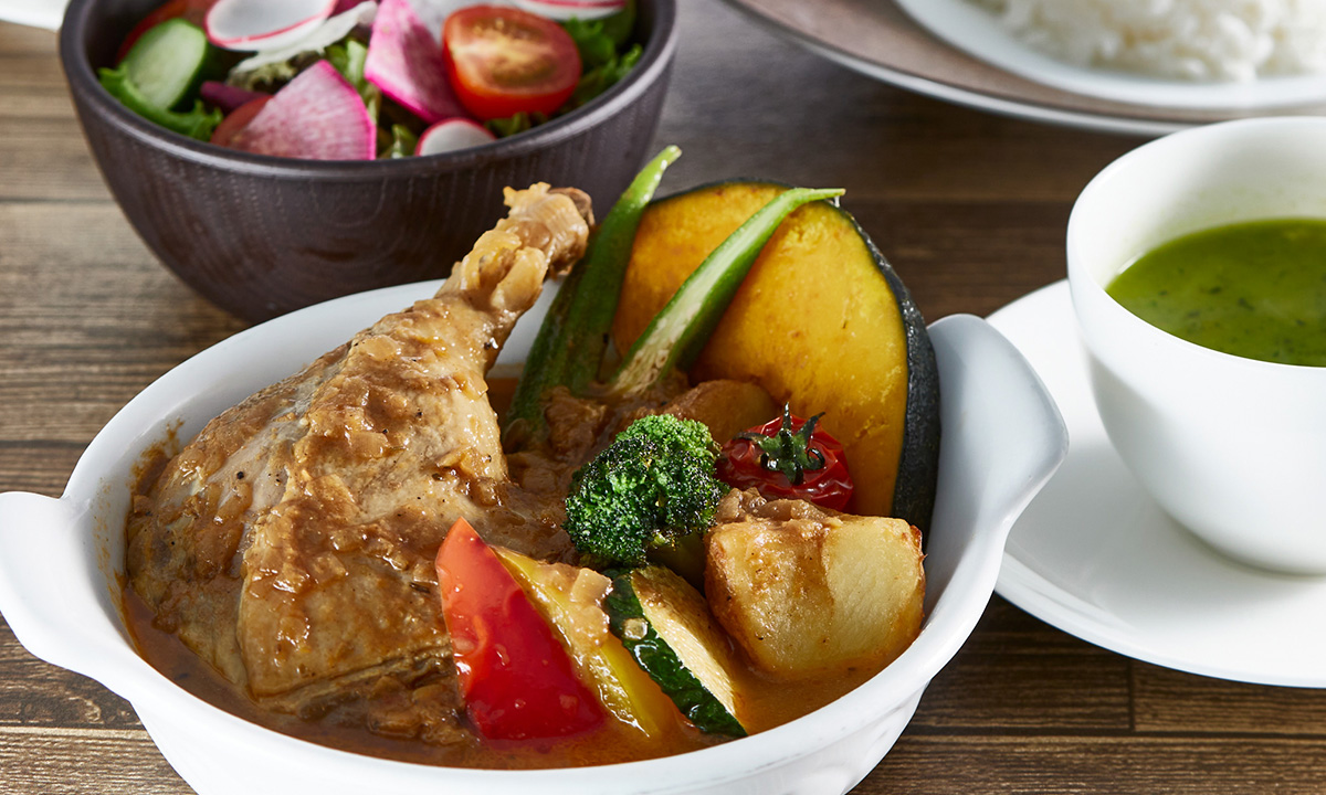 Pumpkin, potato, and broccoli are only a few of the seasonal vegetables generously used in this curry soup recommended by our chef. Savor the rich and spicy flavor of savory chicken drumsticks combined with sweet vegetables.