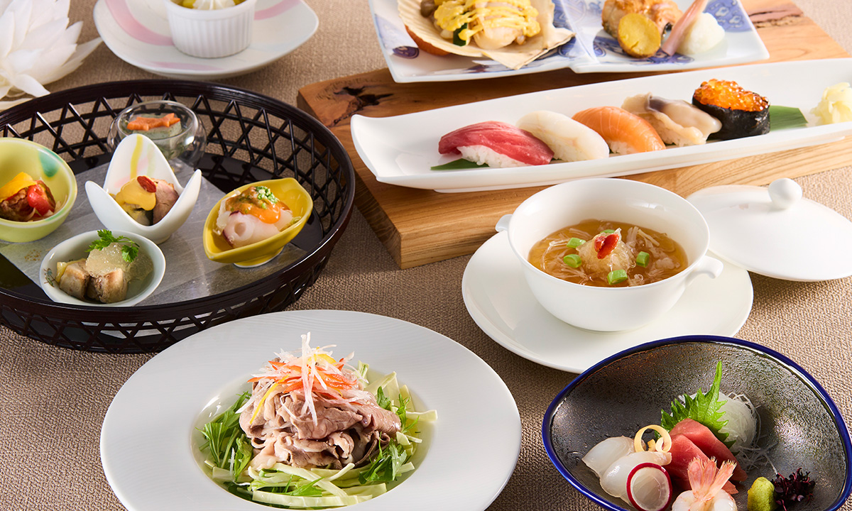 ふかひれやサロマ黒牛、生寿司などの華やかな料理が宴会を彩ります。