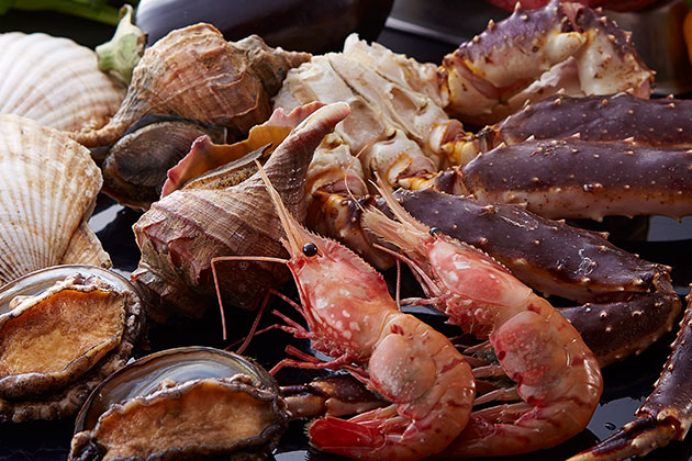 帆立貝、タラバ蟹、活蝦夷鮑など北海道の豊かな海で育った海鮮を厳選。季節によってキンキ、平目、時知らず、サクラマスなどの旬の魚もご用意しております。