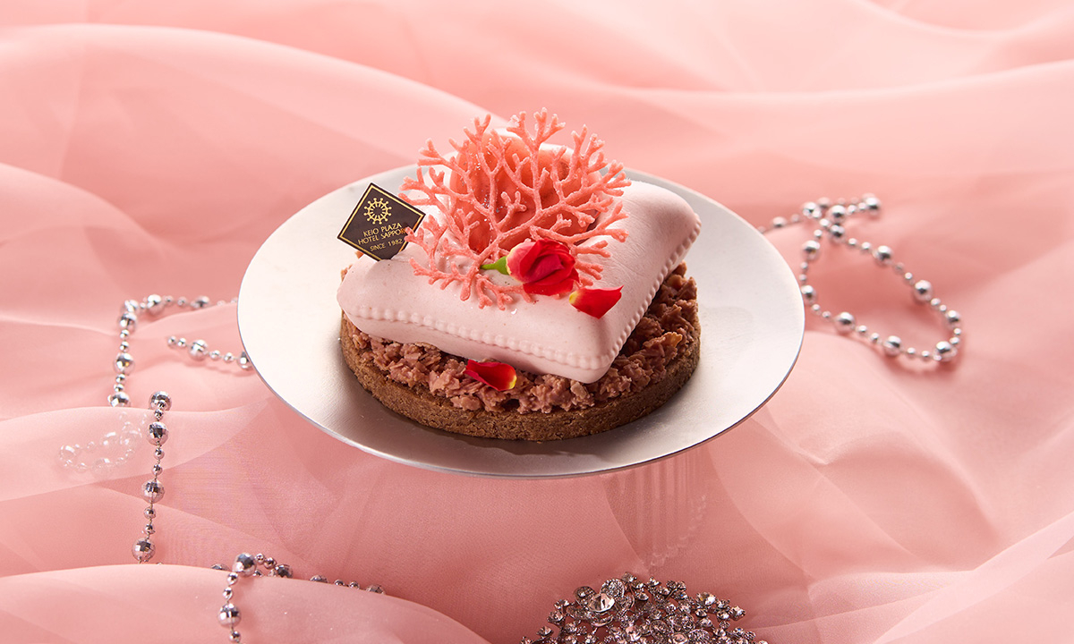とろける桃ムースの中にジューシーな桃のコンポートとルビーチョコレートのフィアンティーヌを入れ、珊瑚をモチーフにしたクッキーで飾りました。