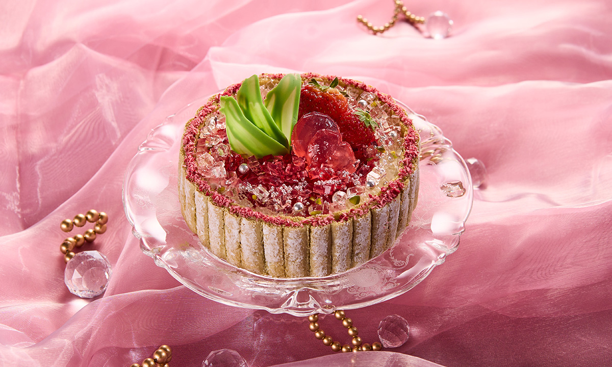 春を感じる淡いピンクの宝石「モルガナイト」をシャルロット仕立てで表現したケーキ。